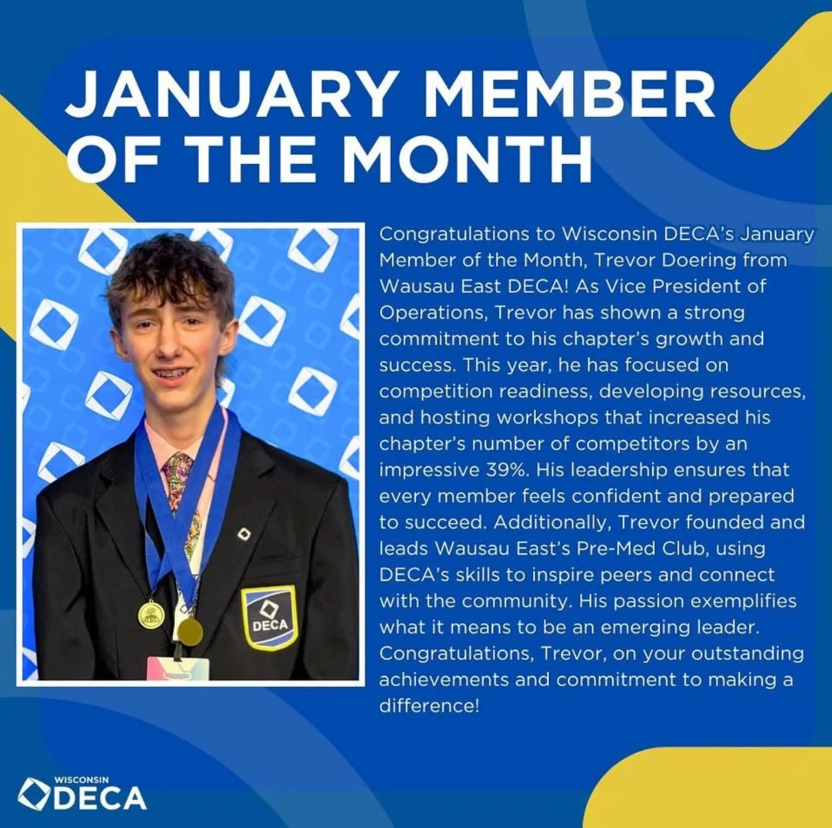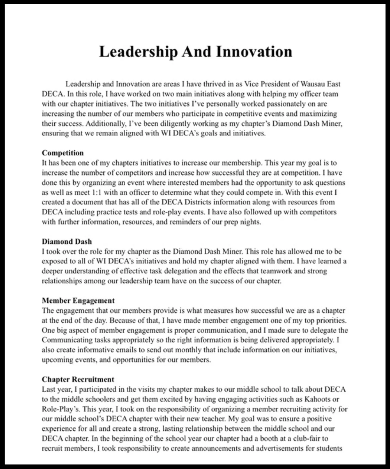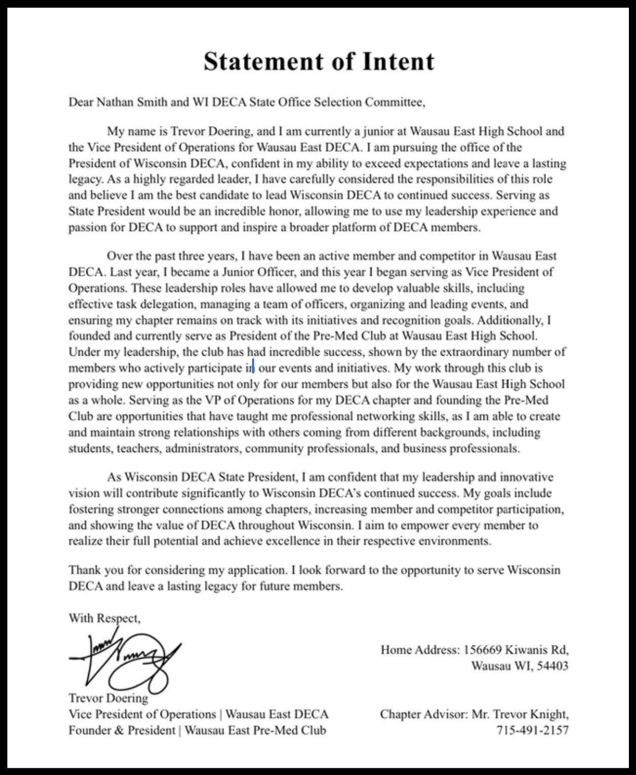 View Resume My Mission “My mission is to lead Wisconsin DECA through its initiatives, increase awareness of the incredible opportunities DECA provides, and empower our members to realize their potential in becoming the next generation of leaders.” January Member of the Month! Letters of Recommendation Open Mr. Knight, DECA Advisor Mr. Barth, WEHS Principal Open Mrs. Truax, Pre-Med Club Advisor Open Other Elements Statement of Intent Open Leadership and Innovation Open Transcript Open